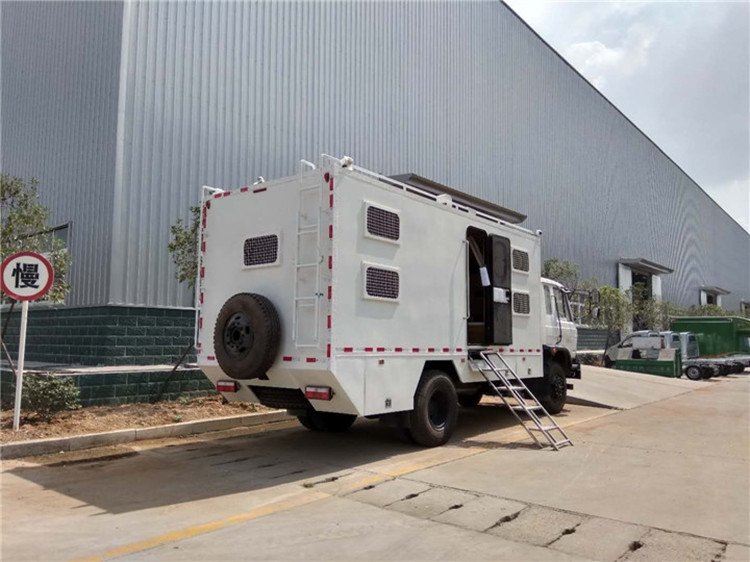 風四驅房車是一款具備越野性能的特種車型,基于4x4越野二類底盤研發,采用分時四驅的驅動系統,特別適用于沙漠、無人區、原野、森林等無路面地形。整車大體分為三個部分:住宿區、廚房區、洗浴區。其中住宿區配有空調、床鋪、電視等基本設備,廚房區有灶臺、爐具、洗菜臺,洗浴區則有太陽能熱水器、洗臉臺、便池等。